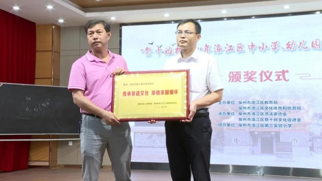 此外,比赛还邀请泉州市教育科学研究所美术教研员陈德煌为教师们作《实施中小学书法教育指导纲要关键举措》专题书法讲座。同时,与会领导还现场为洛江区祭十班文化促进会颁发“传承非遗文化 厚植家国情怀”牌匾。