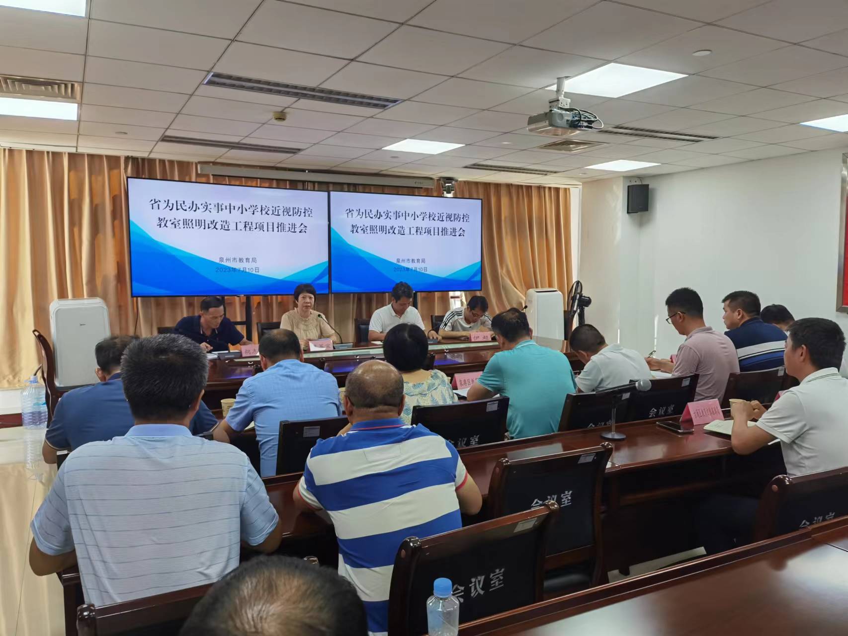 7月10日下午,我市召开2023年省为民办实事项目中小学校近视防控教室照明改造工程推进会。会议邀请省教育厅体卫艺语处副处长徐清周、干部伊超到会指导,泉州市教育局副局长陈军宣出席会议,各县(市、区)教育局项目分管领导和科(股)室负责人、市直学校项目负责人参会。