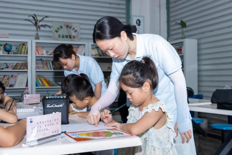 实践队队员指导小朋友绘画(陈宝玉 摄)