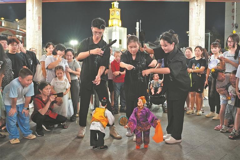“你看,这个木偶会跳舞。”“你们表演得真好!”日前,10名来自福建师范大学泉州附属中学木偶社的同学们亮相状元街“妙音音乐盒”非遗展演舞台,现场演绎原创木偶戏《泉州踩街·“偶”来了》,不仅吸引众多市民游客围观、点赞,也让鲤城学子的暑期多了一份非遗韵味。