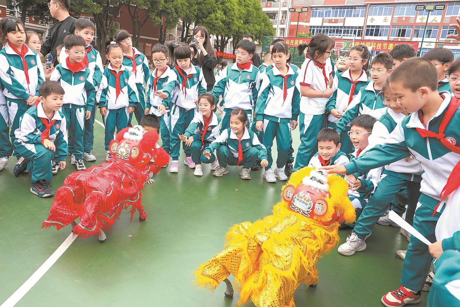 “快看!机器狗会‘跳舞’!”“天空有彩色烟雾!”泉州师范学院附属小学的操场上欢呼声、惊叹声此起彼伏,该校第29届校园科技节正式拉开帷幕。16个小型机器人迈着整齐步伐“列队起舞”,灵活切换队形;2只身披狮装的机器狗更秀出摇头摆尾、转圈互动等动作,憨态可掬的模样让同学们拍手叫好,现场掌声与笑声不断。随后,天空中无人机拖着彩色烟雾腾空而起,一条布制的红色“中国龙”紧随其后,龙身在空中灵活盘旋、蜿蜒前行,与彩色烟雾交织着拉出灵动弧线,宛如“科技长龙”遨游校园上空。