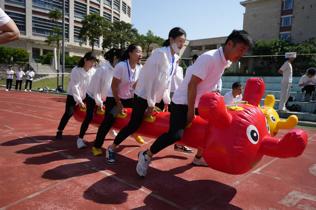 活动包括趣味运动会和徒步活动两个大项,其中趣味运动会设置了毛毛虫竞赛、滚铁环竞赛、同心击鼓竞赛三项。赛场上,运动员们个个精神饱满,跨骑“毛毛虫”协同冲刺,整齐划一,展现矫健身姿;手持铁钩推动铁环,用最稳的速度快速到达终点;同心击鼓时,众人屏气凝神、力往一处使,让小球在鼓面欢快起舞。徒步活动则以丰泽区蟳埔民俗文化村为起点,选手们头戴簪花穿行于充满闽南风情的街巷,最终抵达见证海丝历史的真武庙,全程约5公里。运动员们用汗水与激情诠释团结协作精神,展现昂扬拼搏的精神风貌,共同绘就“强体魄、育新人、传文脉”的教育图景。