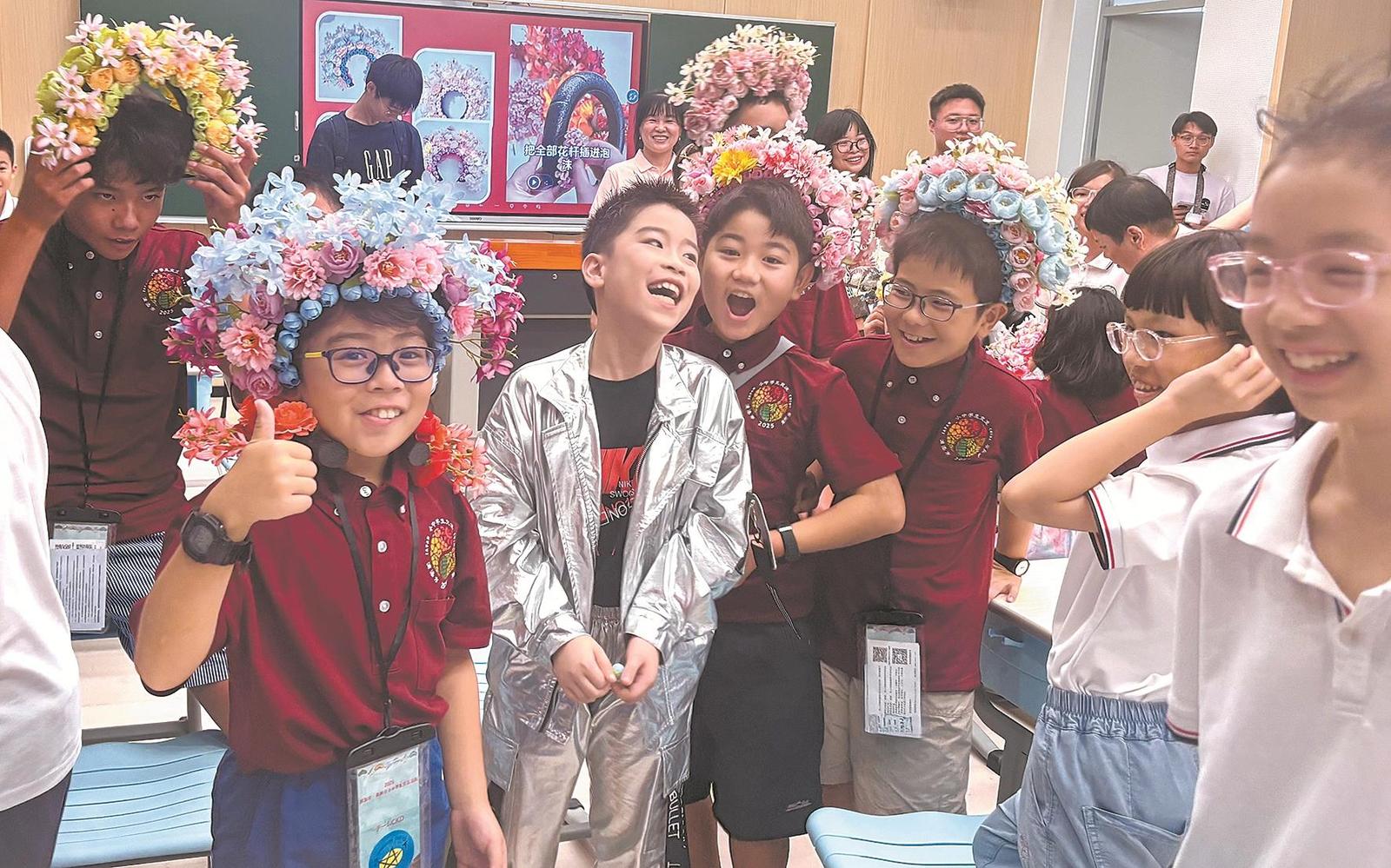 泉州簪花体验课上的文化交融更显细腻。泉州市第二实验小学学生许可缘化身“中外人文交流小使者”,向浦添市小朋友介绍泉州簪花的历史。河合稀拓是浦添市牧港小学五年级学生,虽然个子小,却充满激情与活力,他和小伙伴戴着簪花挤在镜头前,头顶的花朵与灿烂的笑脸相映,教室里充满了快活的氛围。在体验完簪花制作后,他说:“泉州的簪花太漂亮了,代表中国传统艺术之美。能和中国的小伙伴一起学习制作很高兴!”