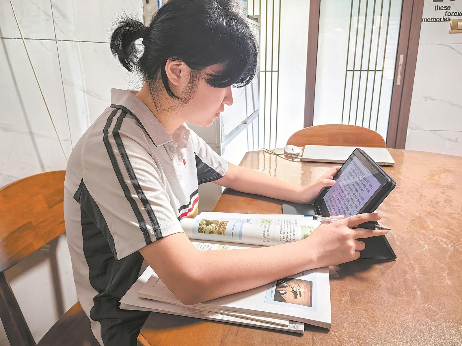 今年暑假,高一年全体师生人手一块智慧课堂学习终端(平板)带回家,可完成在线作业提交、教师在线答疑、学生AI自主学习等。