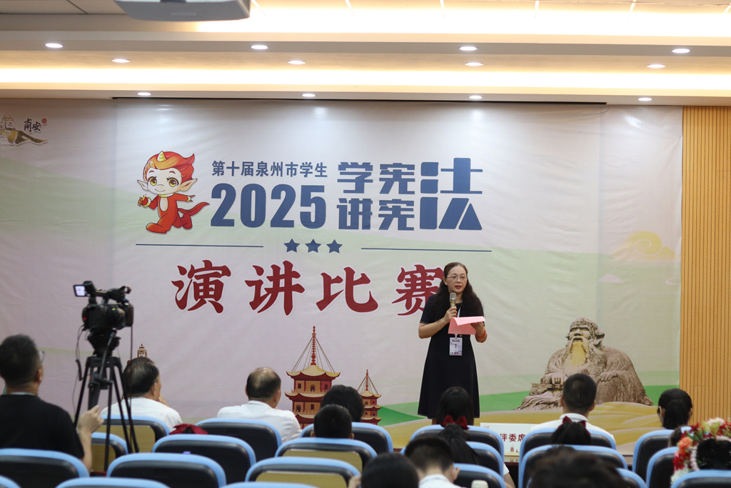 为深入贯彻党的二十大和二十届三中全会精神,全面落实习近平法治思想、习近平总书记关于教育的重要论述和全国教育大会精神,持续推进对青少年学生的宪法法治教育,根据教育部、省教育厅的有关工作部署要求,8月19日,由泉州市教育局、泉州市司法局主办,南安市教育局、南安市司法局承办,南安一中协办的泉州市第十届学生“学宪法 讲宪法”遴选活动在南安一中江北校区成功举办。泉州市委教育工委委员、市教育局党组成员、副局长林长华,泉州市司法局四级调研员杜世强等领导莅临现场指导并出席颁奖仪式。