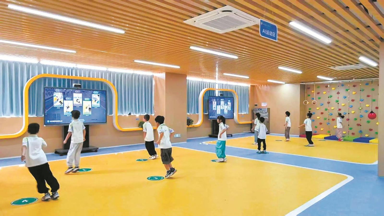 泉州市第二实验小学学生在AI体能体测馆中,通过视觉识别技术进行体能训练。