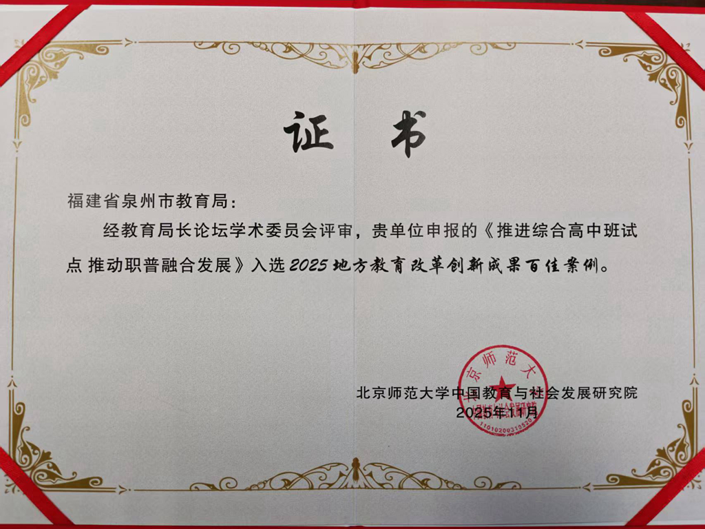 11月15-16日,由北京师范大学主办,北京师范大学中国教育与社会发展研究院承办的第四届教育局长论坛在珠海举行,泉州市教育局陈军宣副局长及相关科室工作人员参会。开幕式上,论坛组委会发布了“2025地方教育改革创新成果百佳案例”评选结果,泉州市教育局报送的《推进综合高中班试点 推动职普融合发展》案例,成功入选全国2025地方教育改革创新百佳案例,并被评为41个优秀案例之一受邀在平行论坛分享。