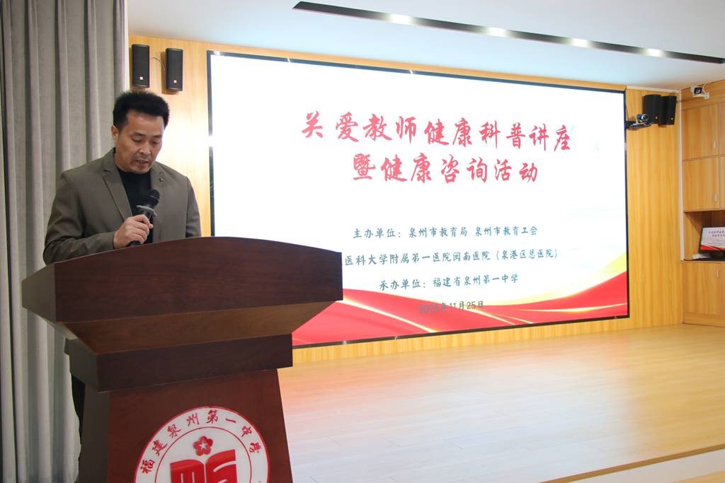 泉州市教育局二级调研员、市教育工会主席郑建聪出席并致辞。郑建聪主席在致辞中表示,教师是教育事业的基石,身心健康是教书育人的前提。希望通过此次活动,老师们能够学到实用的健康知识,并且把知识带回家、用起来。