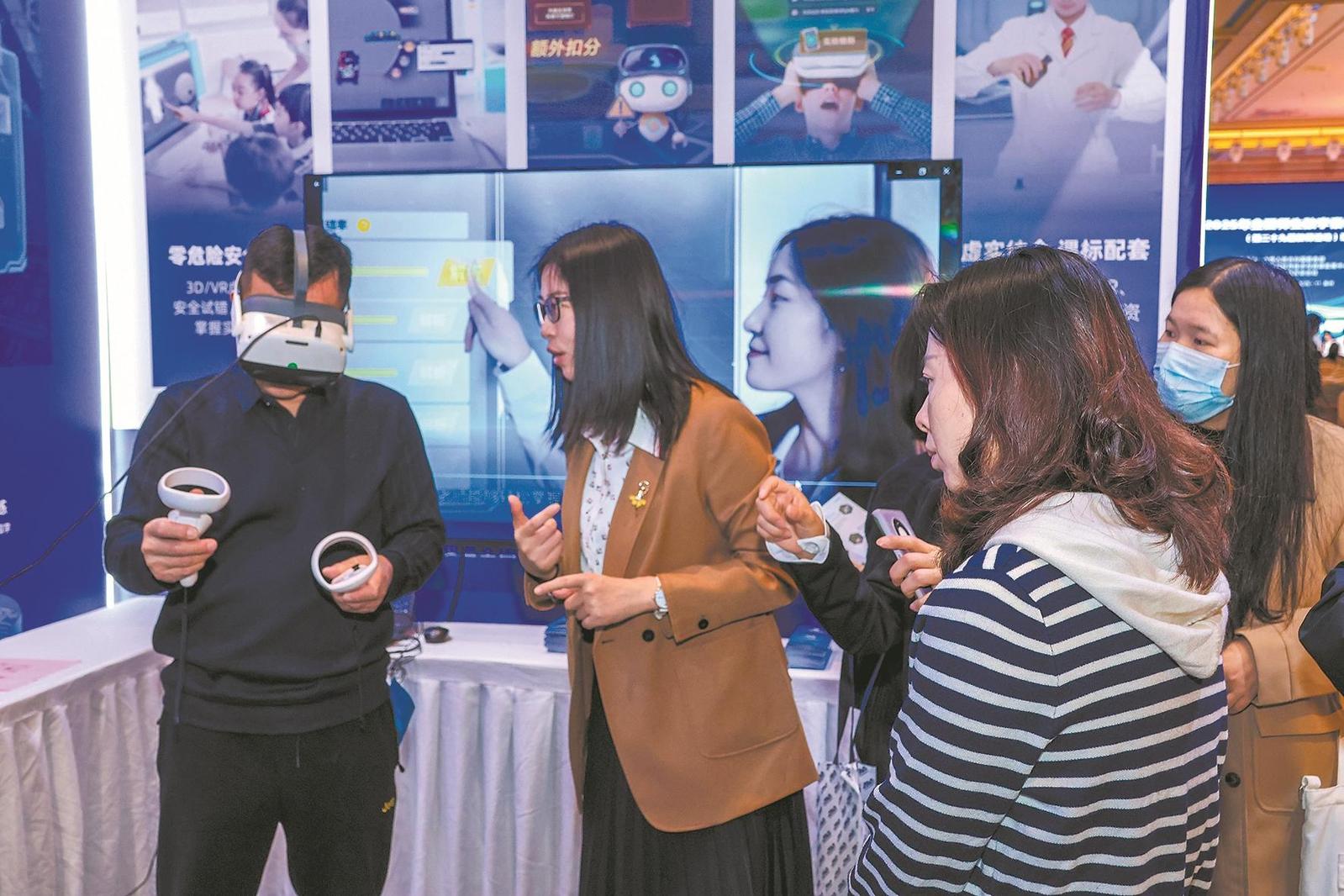 在教育数字化装备应用互动体验区,老师们体验智能设备。