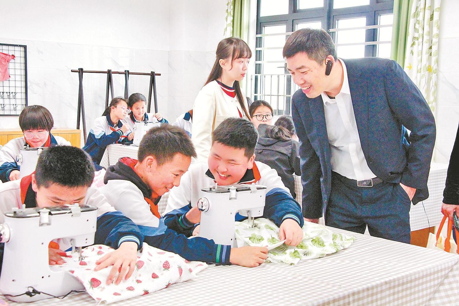 学生在劳动课上学习缝制挂包