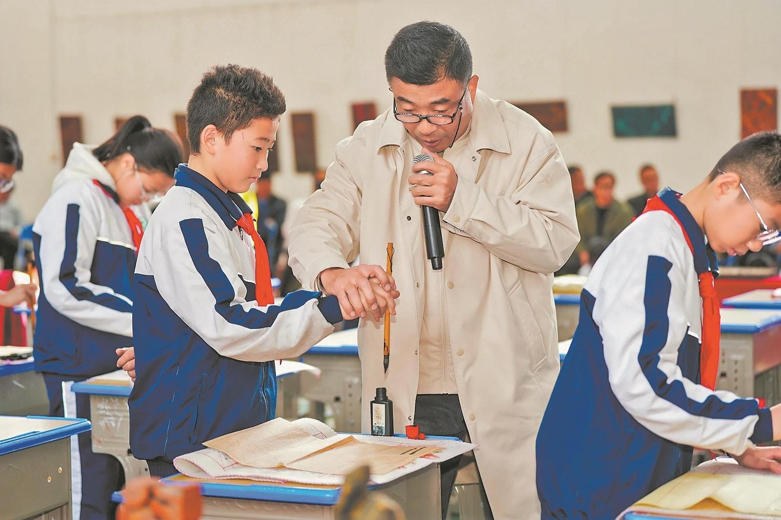 展示课上,老师手把手指导孩子们如何正确握笔。