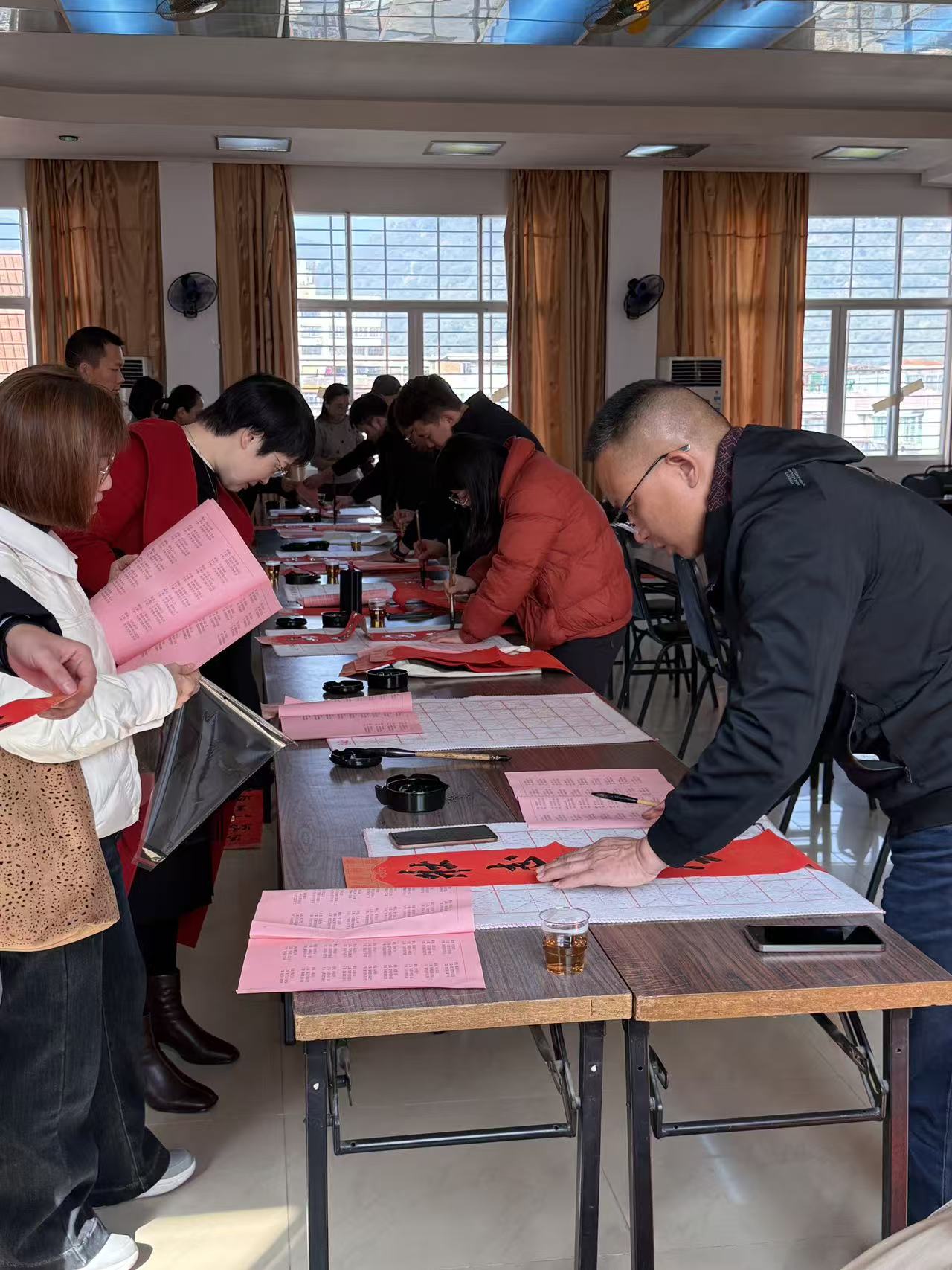 活动当天,市教育局主会场内墨香萦绕、暖意融融。受邀的教育系统书法家们满怀热忱、挥毫泼墨,笔锋流转间,一幅幅寓意吉祥的春联与“福”字跃然纸上。这些春联佳句既饱含对新春的期盼,也寄托着对泉州教育高质量发展的美好祝愿,引得在场教职工驻足欣赏、踊跃领取。大家手持崭新的春联,脸上洋溢着幸福的笑容,现场热闹非凡。