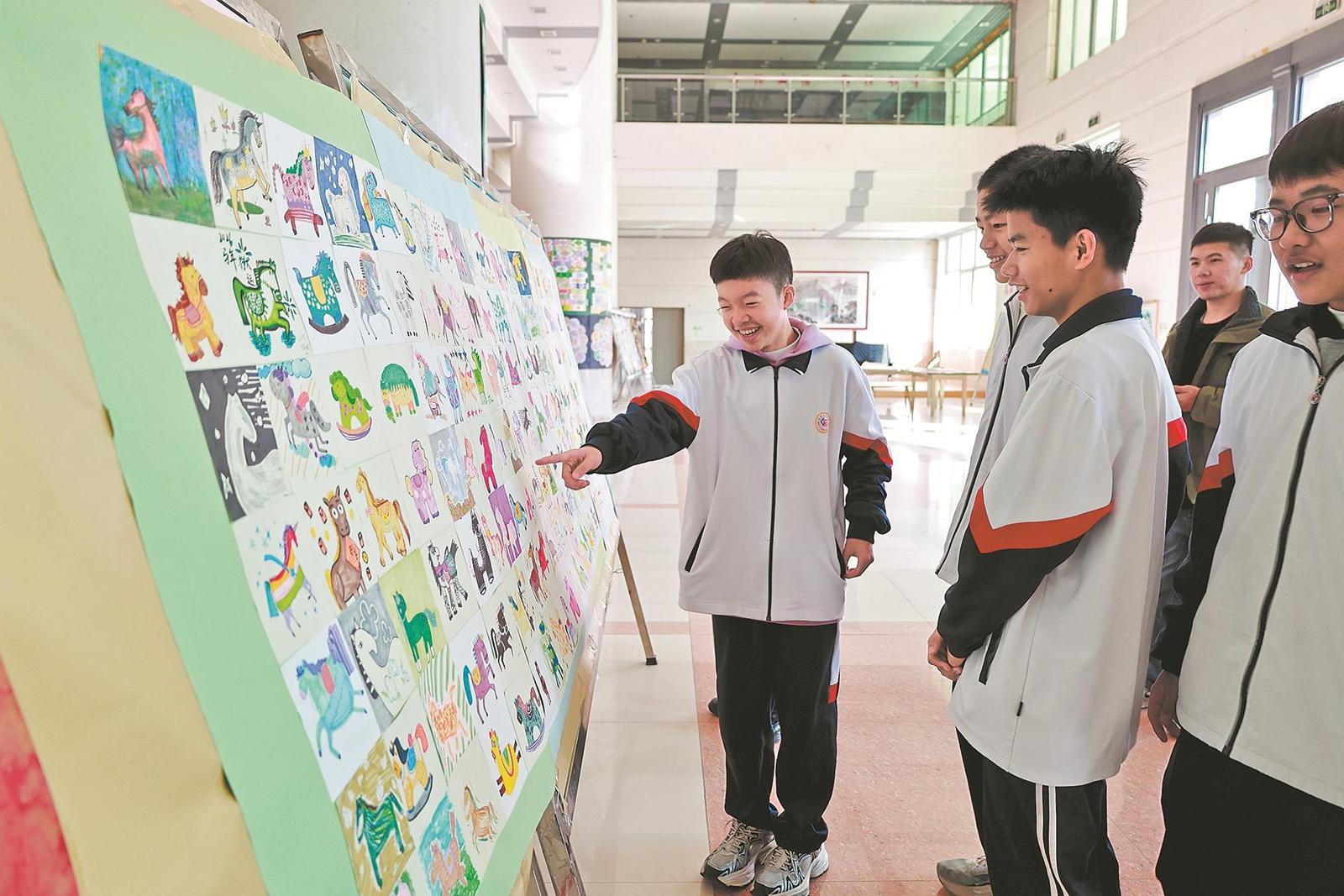 来到石狮市石光中学,新春艺术氛围同样浓厚。鬃毛飞扬、身姿矫健的“奔腾骏马”,身披斑斓色彩、灵动鲜活的“阳光彩虹马”,肚大臀肥、憨态可掬的“萌萌马”,背上驮着“福”字、寓意美好的“吉祥马”……形态各异、栩栩如生的骏马形象,汇聚成一面极具视觉冲击力的“百马图”墙,成为校园里一道亮眼的风景。这面“百马图”墙由近百幅迷你“马”主题画作拼接而成,每一幅作品都出自不同学生之手,承载着学生们心中对马的独特观察与表达,拼接出一片灵动鲜活的骏马天地。