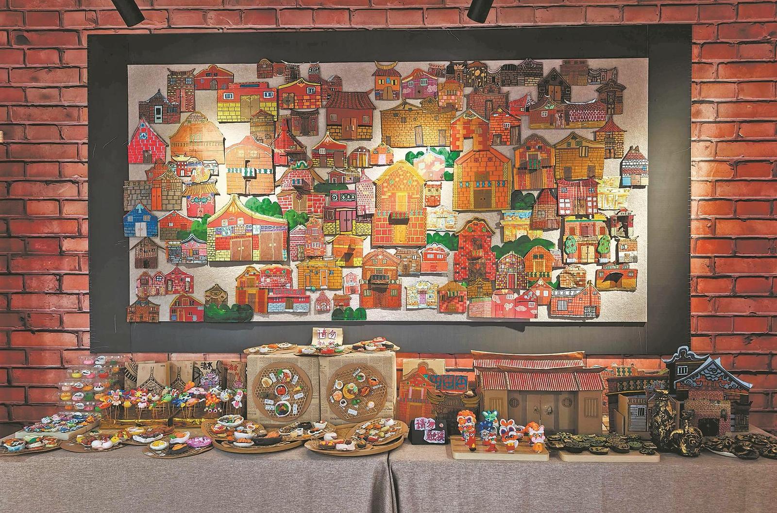 展览聚焦花砖、滴水兽、特色小吃、古厝建筑四大文化符号,学生们在理解传统的基础上展开创作:花砖纹样,在保留传统宝相花纹样的吉祥寓意的基础上,融入新颖的几何线条与色彩,形成复古与新潮兼具的冰箱贴、钥匙扣等文创设计;金鱼、麒麟等传统滴水兽造型经卡通化、夸张化再造,焕发现代设计趣味;超轻黏土制作的肉夹包、四果汤、姜母鸭等小吃模型,生动还原“闽南风味”;而对古厝的线描写生与立体建模则引导学生从建筑中感悟人文内涵。